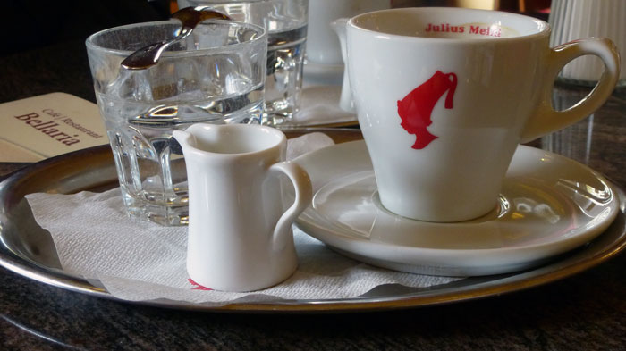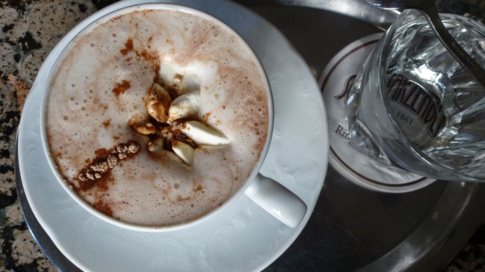 Le Kleiner Schwarzer ( petit noir) ou le Mokka : café noir simple ou double, proche de l’expresso; le Kleiner Brauner (petit brun) : un petit café noir servi avec une petite cruche de crème ( c’est ce qu’on nous sert si on ne demande pas le premier); le Grosser étant le grand café; le Verlängerter (rallongé), version allongée avec de l’eau chaude; le Kapuziner : beaucoup de café, un soupçon de lait et une goutte de crème; le Melange, celui qui ressemble au café crème français ; le Kaffee verkehrt (café inversé), le cafè latte des Italiens…mais la liste est beaucoup plus longue !