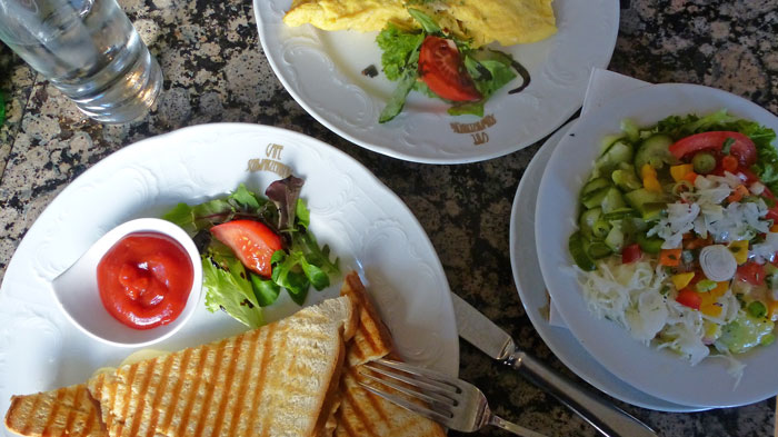 Il y avait peu de monde car il était un déjà tard et le repas a été agréable et servi avec professionnalisme. Une omelette avec des « pommes frites » ( en français sur le menu), un toast et une salade.