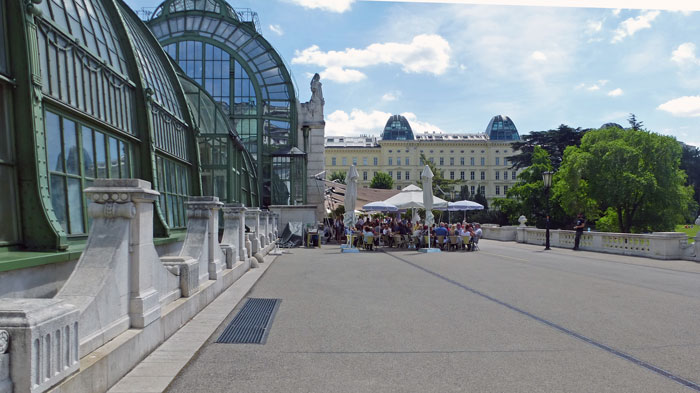 Nous sommes entrés dans le café de la Palmenhaus, la serre des palmiers et ancienne orangerie, qui surplombe le jardin du Burggarten et jouxte l’immense serre de papillons.
