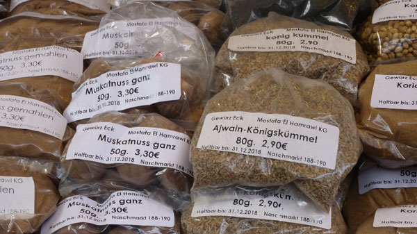 Nous avons fait les courses pour le dîner avant que les commerces de détail ne ferment. Là, j’ai été fascinée par les étals de fruits secs, d’herbes aromatiques et d’épices du monde entier. Nous avons acheté des filets de truites fumées ( forellen) à la poissonnerie Nordsee, ainsi que des fruits et des légumes frais. Nous avons acheté un vin blanc Grüner Veltliner Réserve et un rouge Münzenrieder Classic Zweigelt 2011 dans un stand de vins, tous les deux autour de 14 €.