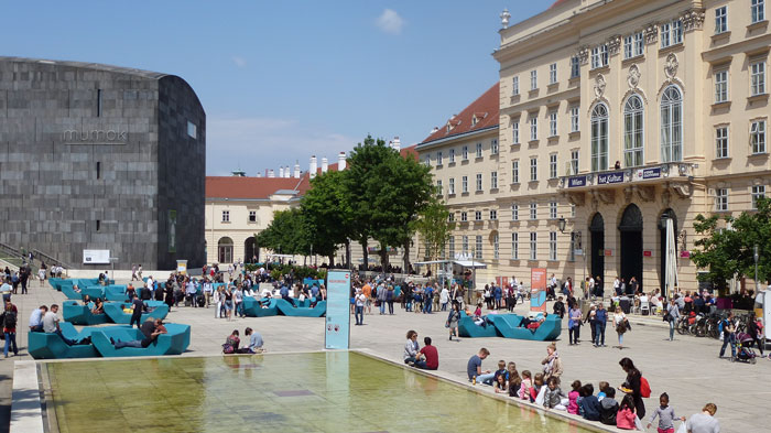Le MuseumsQuartier Wien (MQ) est un endroit incroyable, situé en plein centre de Vienne et nous y avons passé plusieurs heures. C’est un complexe culturel géant avec des cafés et des restaurants, situé dans les anciennes écuries de la Cour impériale, à deux pas du Palais. Nous nous sommes promenés sur l’immense espace extérieur qui propose des concerts à certaines heures et où on peut se reposer sur d’immenses sièges. Nous n’avons visité que le Musée Leopold, qui abrite de nombreux tableaux de Schiele et c’est là que nous avons déjeuné ( un succulent plateau brunch détox à 9 € ) mais il nous faudra revenir pour visiter le Musée d’Art moderne et la Kunsthalle.