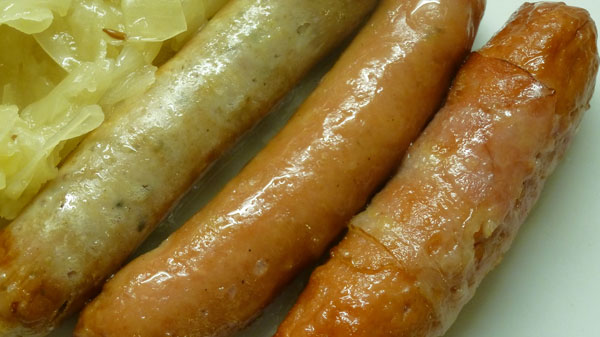De gauche à droite, la Käserkrainer, avec du fromage à l’intérieur qui fond à la cuisson, la Bratwürst, la saucisse de base et la Berner Würstel entourée de Speck.