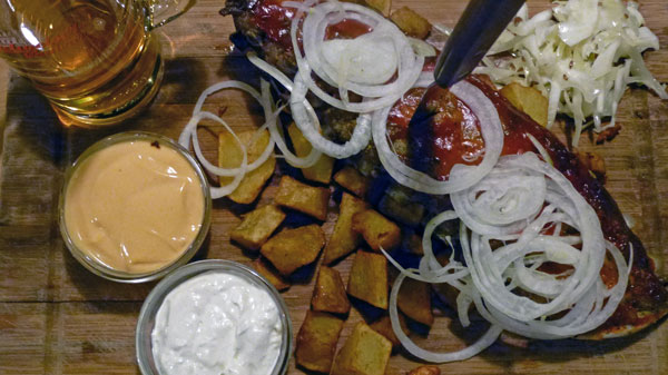 Désireux d’accompagner notre repas de bière autrichienne et de manger local, nous avons dîné dans un des restaurants de la chaîne Centimeter, le Centimeter II. On y trouve une variété impressionnante de bières à la pression ou en bouteille. Les bières que nous avons goûtées étaient bien fraîches et excellentes. Ayant quelques difficultés à choisir les plats – le menu étant uniquement en allemand – ils nous ont apporté un carnet pour étrangers avec le nom du plat et la photo. Les plats nous ont un peu déçus. Le « Spare Ribs » ( qui existait en 3 tailles allant du M au XL) recouvert d’oignons, était correct mais les frites étaient un peu trop brûlées et l’hamburger « Wagyu Kobe Style » présenté dans un plat géant n’était pas vraiment savoureux, mais nos voisins de table avaient l’air de se régaler. Nous avons partagé un dessert pour deux: une gaufre au Nutella avec de la banane et… de la chantilly. Il faut bien reconnaître que ce n’était pas cher, des plats à 9,90€ avec des bières -pression autrichiennes à 2,90€ les 30 cl. En fait, dans ce même quartier de Neubau (du 7º arrondissement), il y avait non loin d’autres restaurants, italiens entre autres…