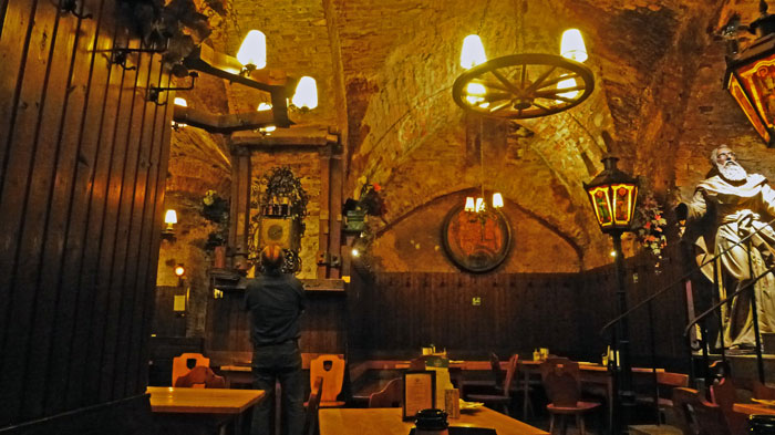 L’après-midi, nous sommes retournés dans les rues piétonnes du centre mais avons découvert aussi des petites ruelles avec des bars et des terrasses. Notre dernière halte a été pour le heuriger Zwoelf Apostekeller , la cave des 12 apôtres, dans le quartier de la vieille université. Encore un endroit surprenant datant de 1339 où l’on accède par un escalier étroit. Nous n’y avons bu qu’une bière mais un coup d’oeil à la carte nous a permis de voir que les prix pratiqués étaient vraiment corrects tant pour les vins que pour les plats.