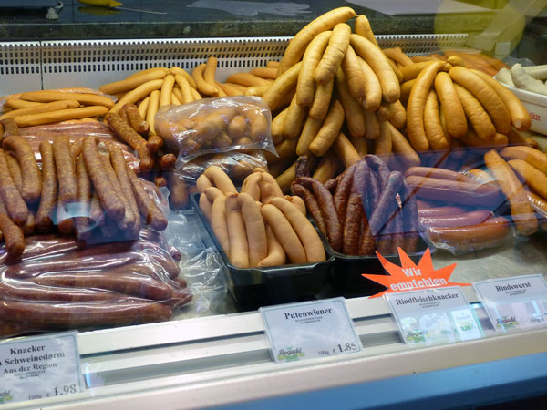 Nous avons contemplé les vitrines du magasin traditionnel Rogacki , dans la Wilmersdorfer Str.145/46 à Charlottenburg. Il s'agit d'une entreprise familiale fondée en 1928 et qui était au départ un fumoir d’anguilles et d'autres poissons. Nous y sommes allés vers midi et il y avait déjà de nombreux clients qui dégustaient des saucisses et d'autres plats , debout dans le magasin.