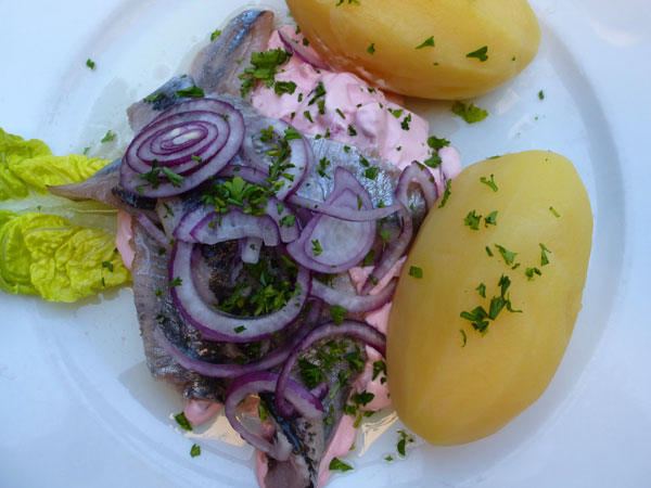 Le hareng est toujours à la carte. Il en existe diverses préparations. Ici, il est servi avec une jolie sauce rose ! Nous avons également goûté les plats suivants:
