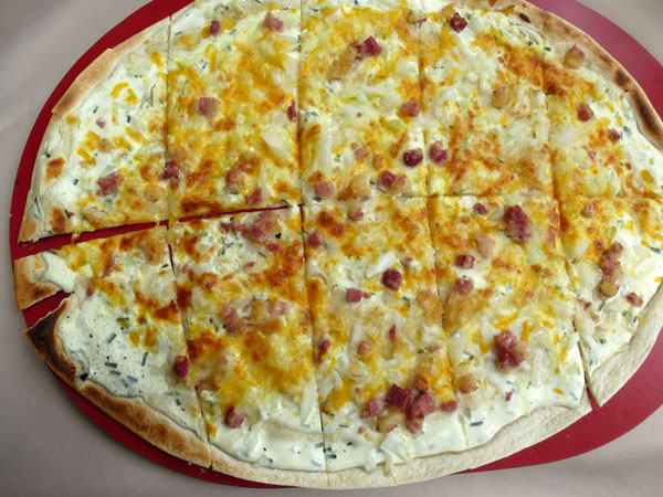 Et aussi... la Flamekueche aux oignons, lardons et crème fraîche. Une version allemande de la tarte flambée alsacienne.