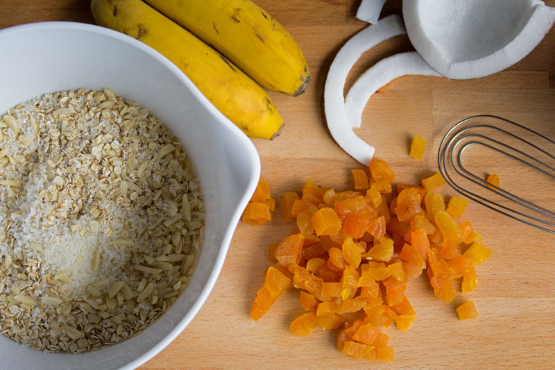 Dans un saladier, mélanger les flocons d'avoine et de coco avec les amandes (ou les noisettes) puis les abricots.