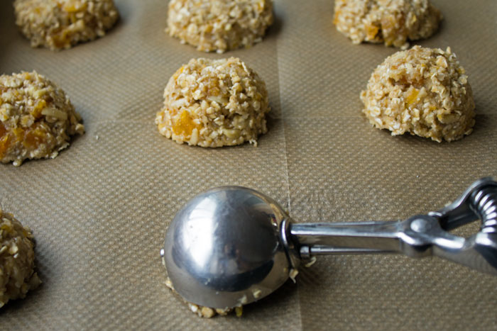 Dėposer des petits tas de pâte sur la plaque à pâtisserie recouverte d'une feuille de cuisson. Comme je suis en période de glaces, j'ai utilisé ma cuillère à glace que j'ai rempli de pâte à raz bord, j'ai déposé le contenu en actionnant le mécanisme puis j'ai aplati légèrement chaque palet avec la main.