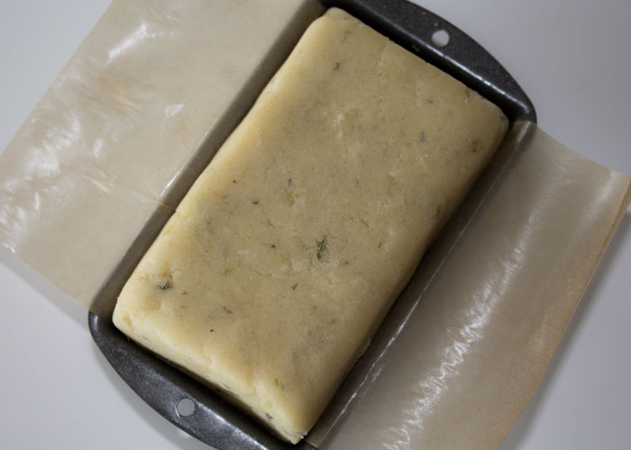 - On nous conseille souvent de former un boudin mais je ne trouve pas cela évident. Sachant qu'il me faudrait découper la pâte, j'ai utilisé un petit moule à cake de la façon suivante : je l'ai tapissé d'une rectangle de feuille de papier de cuisson afin de recouvrir 3 des côtés et j'ai placé la pâte dedans en tassant bien pour qu'il n'y ait pas d'espaces vides et afin d'obtenir un parallélépipède ( bien que je ne sois pas férue de géométrie).