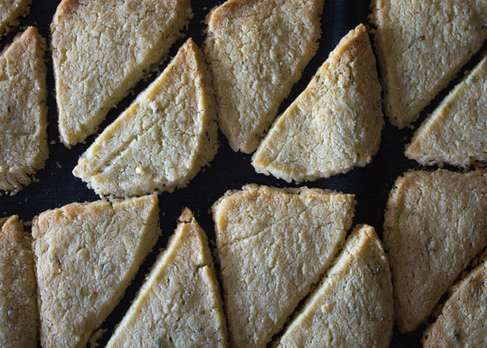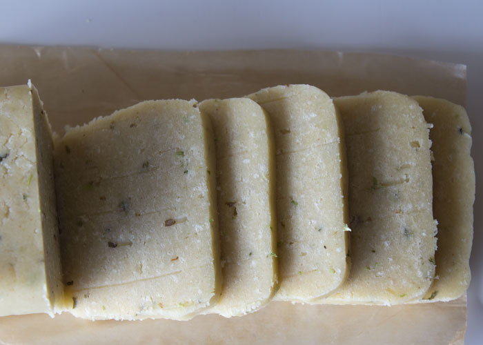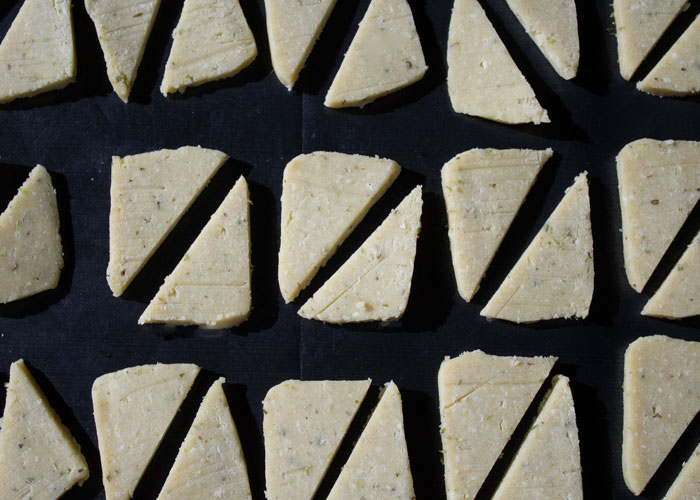 9. Découper le rectangle de pâte en tranches assez fines si vous voulez des biscuits croustillants, un peu plus (au moins 1/2 cm) si vous voulez la consistance de sablés. Je les ai découpés en 2 pour obtenir 30 triangles.