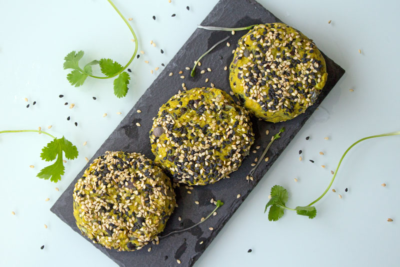 - Former des burgers avec les mains et les poser dans une assiette remplie de graines de sésame. Les retourner en appuyant légèrement pour faire adhérer les graines.
