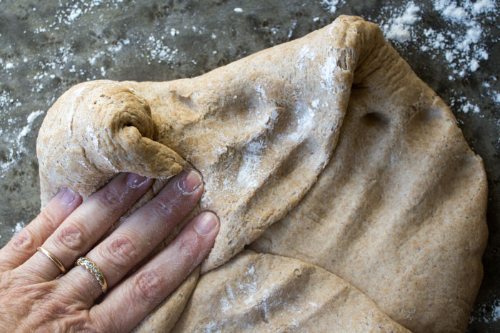 9. Pétrir de nouveau la pâte pour enlever les bulles d’air. Cela s'appelle dégazer. Il faut la travailler avec le poing et les mains pour l'aplatir comme une galette...