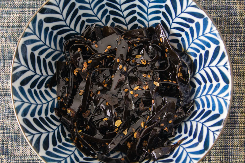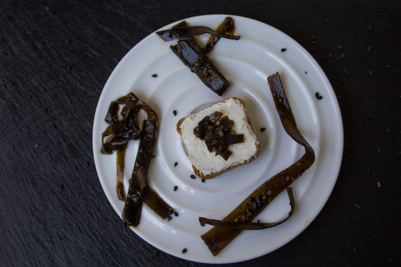 Je vous ai déjà parlé de l’algue Kombu, cette algue charnue au goût iodé et légèrement fumé. Avec le Nori et le Wakamé, c’est l’une des algues les plus utilisées au Japon. Le kombu japonais vient principalement d’Hokkaido mais on trouve maintenant de l’algue produite en Bretagne ou dans la région de Vigo, en Espagne. Le kombu confit peut être proposé à l’apéritif ou pour accompagner un riz blanc. Dans un bocal, il peut se conserver au frais plusieurs semaines. Je l’ai servi en apéritif sur des toasts de fromage frais. Pour plus d’informations sur les produits utilisés, cliquez sur mon lien Découvrir la cuisine japonaise.