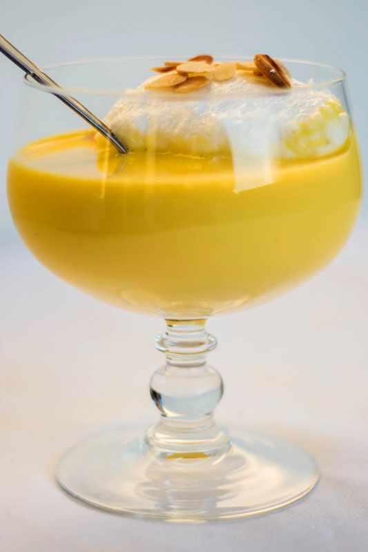 - J'ai servi ma crème dans des coupes avec une île flottante et des amandes effilées.