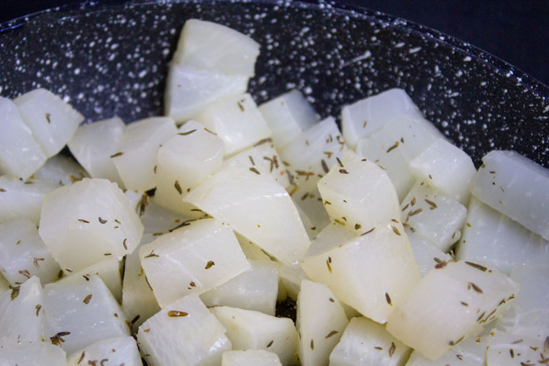 Le temps de cuisson dépendra bien-sûr de la qualité des navets mais le fait de les couper en petits cubes permet une cuisson rapide. Je les fais blanchir d’abord pour les poêler en un second temps. Navets bio de saison conseillés.