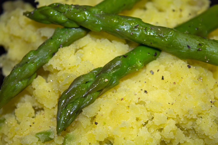 - Servir l'écrasé de pommes de terre sur un plat : l'arroser d'un filet d'huile d'olive, poivrer puis disposer les points d'asperges sur le dessus.