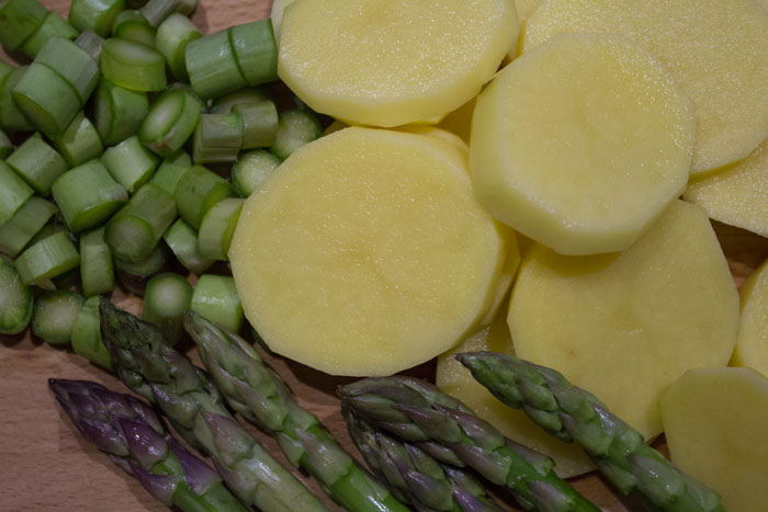 - Laisser cuire encore quelques minutes après l'ébullition puis ajouter les pointes d'asperges et laisser cuire à petits bouillons environ 10 minutes en vérifiant la cuisson des pommes de terre avec la pointe d'un couteau.