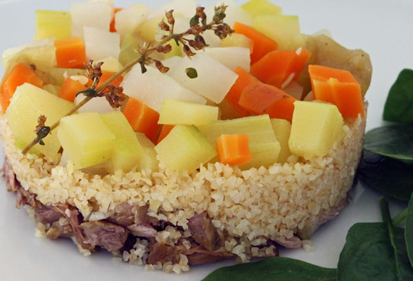 Commencer par répartir l'agneau dans chaque cercle en tassant avec le poussoir, ajouter une couche de graines de couscous ou de boulgour en tassant à nouveau. Arroser d'une cuillère de jus de cuisson.