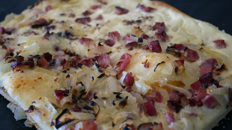 On peut la réaliser avec une pâte à pain ou à pizza tartinée d'un mélange de crème épaisse et de fromage blanc (ou de mascarpone) recouvert d'oignons et de lardons. La pâte doit être abaissée très très finement, c'est le secret de la réussite. Je vous conseille vraiment de faire revenir les oignons à la poêle avant de les déposer sur la tarte.