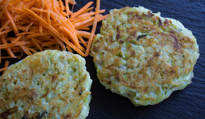 Avec un petit reste de riz et de légumes cuits, voici des galettes végétariennes prêtes en moins d'un quart d'heure. Je crois que je prévoirai plus de restes la prochaine fois !