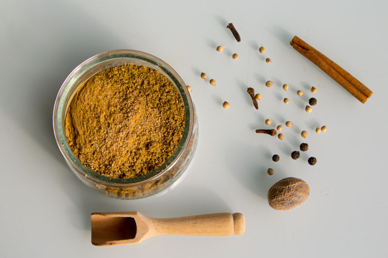 Il s'agit d'un mélange de graines qui doivent être chauffées sans brûler avant d'être broyées. ici, pour plus de commodité, j'ai utilisé des graines (coriandre, cumin, poivre noir, cardamome, clous de girofle) mais aussi des épices en poudre ( cannelle, noix de muscade râpée). les proportions peuvent faire en fonction de vos goûts. J'ai utilisé un vieux moulin à café pour broyer les graines, c'est parfait !