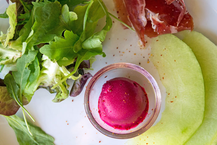 Une recette différente pour une entrée estivale affinée... Une glace, réalisée en sorbetière avec de jeunes betteraves fraîchement cuites, saupoudrée de poivre d'Espelette et servie avec du melon vert, une chiffonnade de jambon fumé et des feuilles de roquette.