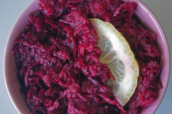 Je la pèle avec un économe et la passe de nouveau sous l'eau du robinet. Ensuite, je la coupe en 4 et je la râpe avec mon robot en utilisant la râpe fine. Compter 300 grammes pour 2 personnes. Pour l'assaisonnement, on peut opter pour un filet de jus de citron et de l'huile d'olive mais non peut aussi utiliser du vinaigre de cidre ou de framboises à la place du citron. Cette recette est réservée aux petites betteraves fraîches.