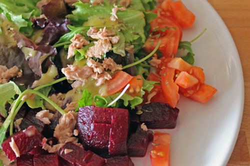 - En salade composée avec des tomates, du thon et une petite vinaigrette à la moutarde... ou encore avec des pommes et des noix.