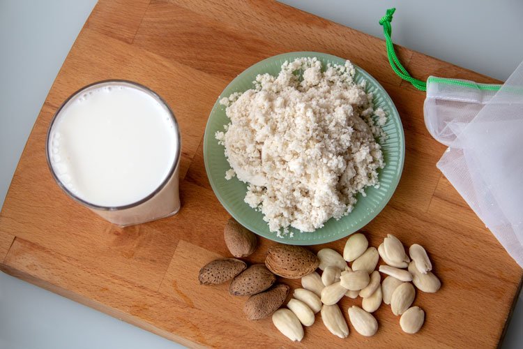 - On obtient alors d'un côté notre "lait" d’amandes bien onctueux et de l'autre une sorte de poudre humide : c'est l'okara d’amandes que l'on va mettre de côté pour l'utiliser ultérieurement.