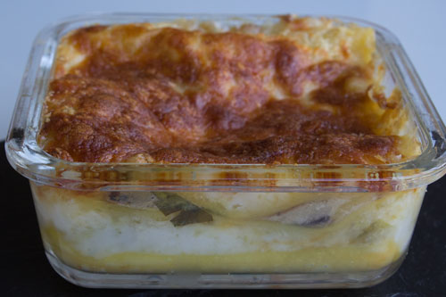 Cette fois, j'ai choisi des lasagnes fraîches biologiques aux œufs. C'est meilleur et de plus, on peut découper les plaques aux ciseaux, ce qui permet de les ajuster au plat choisi. J'ai opté pour une sauce "béchamel" sans beurre, ni farine, préparée avec du lait, de l'huile d'olive et de l'amidon de maïs en ajoutant de l'eau pour la rendre plus légère.