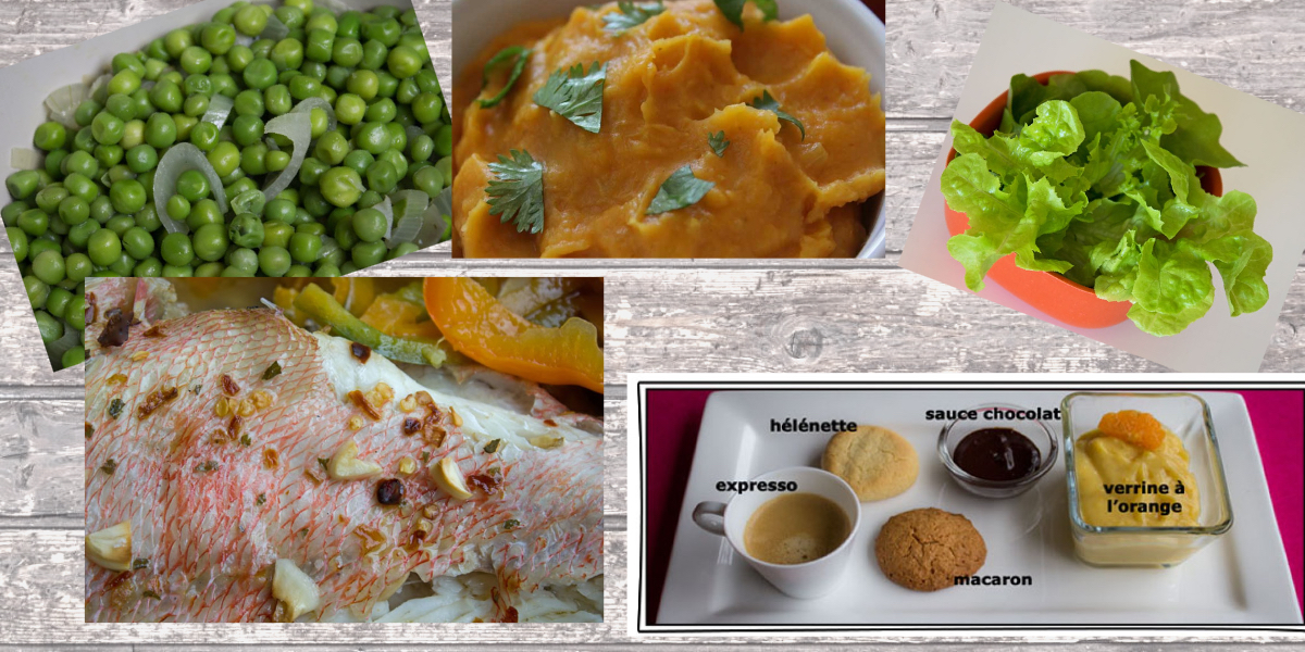 Un menu simple mais coloré avec un plat de poisson rôti accompagné de deux légumes et de salade. Et pour terminer un café gourmand!