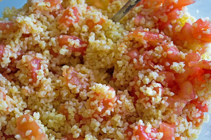 3. Je verse les tomates et leur jus sur le boulgour encore tiède.