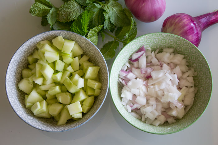 5. J'épluche les concombres et les oignons que je coupe en petits dés.