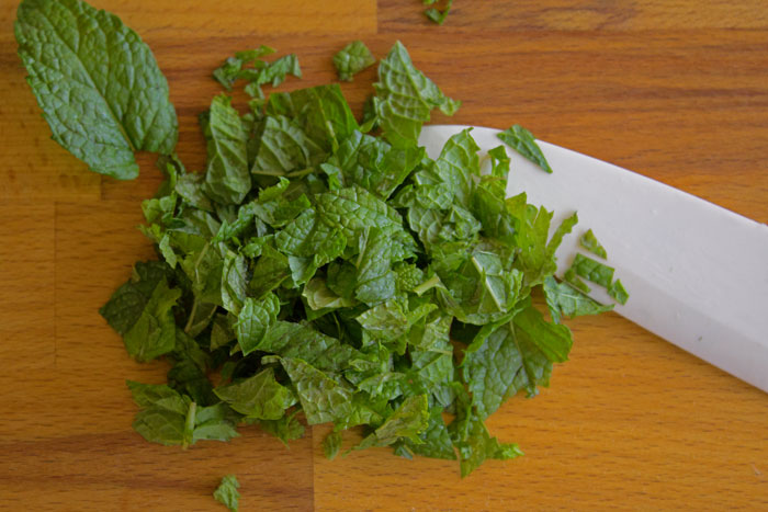 7. Il ne reste plus qu'à ciseler la menthe que je vais chercher sur mon balcon, le luxe ! J'en coupe plusieurs branches que je lave et que je sèche. J'utilise un couteau en céramique qui n'oxyde pas les herbes fraîches.