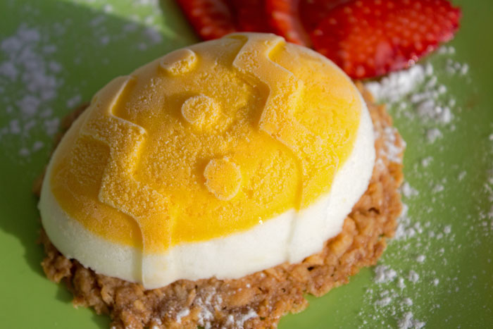 Sur chaque assiette, déposer les fruits, le crumble, puis le 1/2 oeuf glacé.