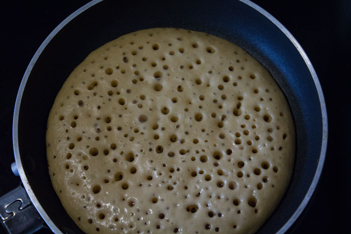 5. Attendre que les bulles soient éclatées et que les bords de la crêpe commencent à être cuits pour la retourner. Compter 2 minutes.
