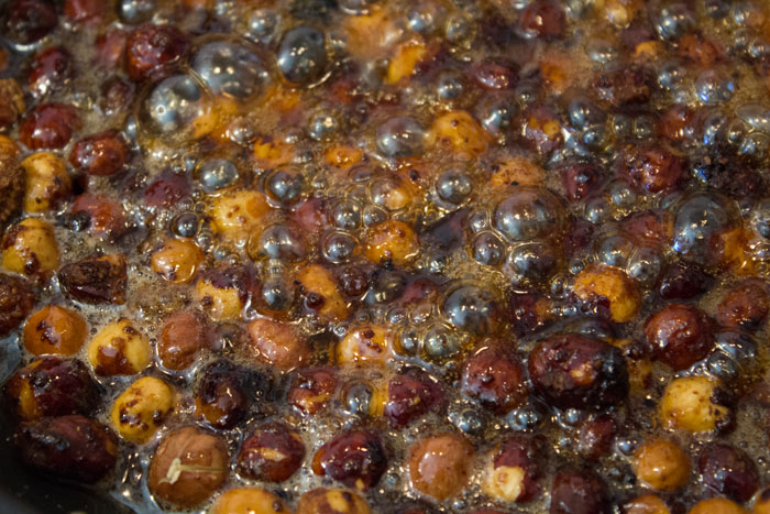 Racler le fond de la poêle en poursuivant la cuisson tout en surveillant la formation du caramel.