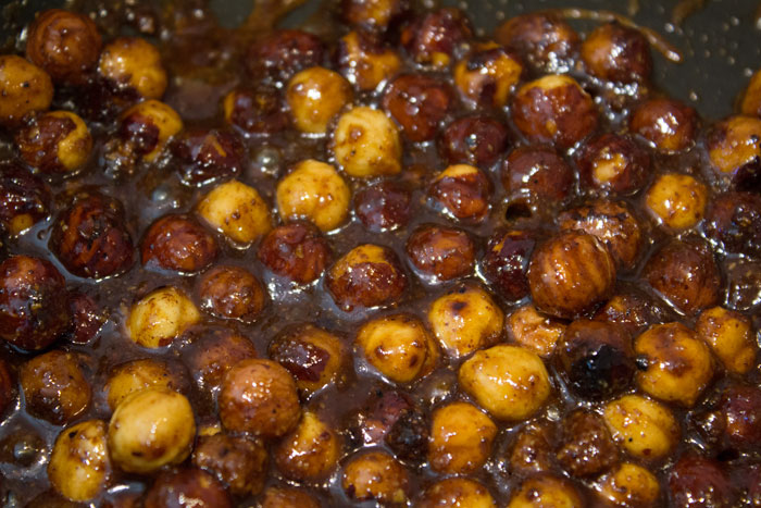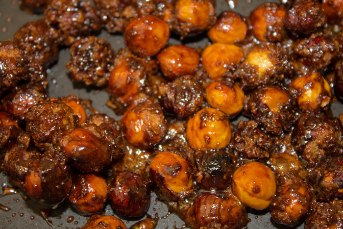 Verser le sirop d'érable et le sucre dans une poêle large à fond ėpais ( en inox par exemple ou en fonte) et amener à ébullition en incorporant le sucre au sirop. Ajouter les noisettes en remuant sans cesse. La poêle doit être suffisamment large pour que les noisettes soient rėparties sur une seule couche.