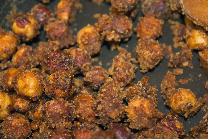 Attention ! Le caramel n'est pas encore réalisé à cette phase. Continuer de remuer énergiquement avec une cuillère en bois jusqu'à ce que le sirop cristallise et ressemble à une poudre sableuse tout autour des noisettes.