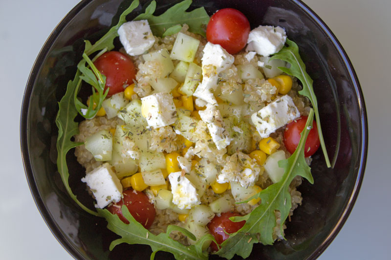 - Dans un saladier déposer les concombres, le maïs, les tomates et la feta. Saupoudrer d'herbes de Provence, puis verser l'huile d'olive et le vinaigre. Mélanger délicatement et répartir dans chaque bol. C'est prêt !