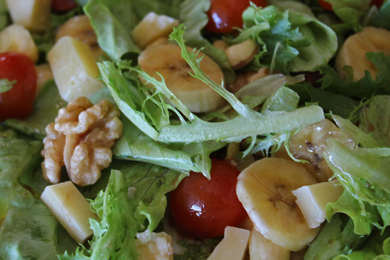 Une bonne petite salade gourmande, fraîche et très vite faite, avec des tomates cerises, des bananes, des noix et des cubes de fromage pour un déjeuner sur le pouce. C'est simple, sain et agréable. Et comme on est souvent pressé(e), j'ai indiqué les quantités pour 1 ou 4 personnes.