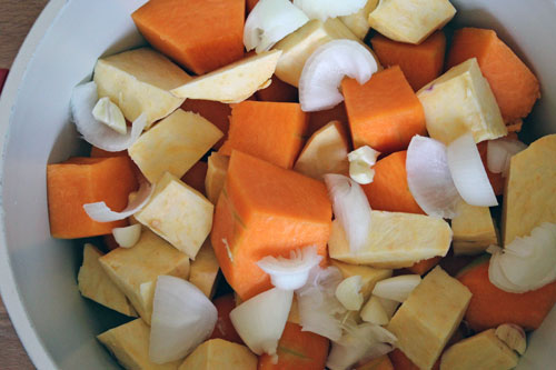 - Laver, éplucher le potiron en ôtant la peau, les graines et les parties filandreuses. Couper la chair en gros dés.