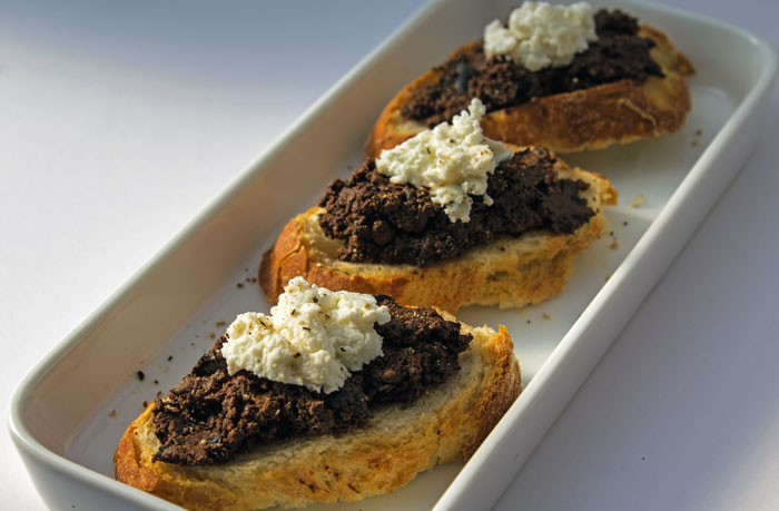 - Recouvrir chaque toast de tapenade, puis placer une pointe de cuillère de fromage au centre.