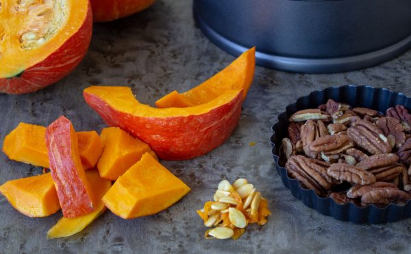 Voici une recette de saison inspirée d’une recette de l’Amérique du Nord. J’ai utilisé du potimarron, des noix de pécan et le délicieux sirop canadien. Pour le reste, j’ai pris quelques libertés. Le résultat est super bon ! Vous trouverez uma recette d’origine dans les notes.