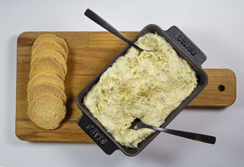 Je vous propose deux options : soit vous réservez votre tartinade au frais dans un récipient couvert afin que les saveurs se développent; soit vous réchauffez la tartinade pendant une quinzaine de minutes à 150º au four, juste avant de servir.