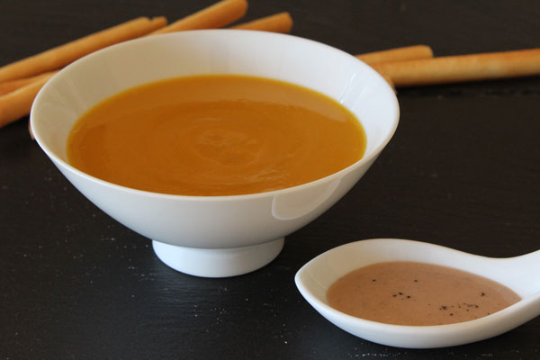 Verser le velouté dans des bols ou des coupelles. Placer le « coulis » de marron chaud, Juste à côté dans une verrine ou une cuillère en porcelaine. Chaque convive le versera dans son bol.