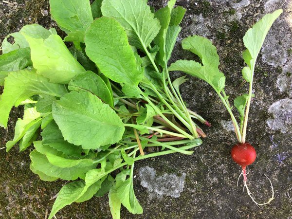 En France, on a coutume de faire revenir les légumes dans le beurre ou l’huile avant de verser le bouillon de poule. C’est bon, certes, mais lorsqu’on souhaite conserver le vrai goût des légumes on peut éviter ces deux techniques tout en obtenant un potage savoureux. Par contre l’huile d’olive additionnée d’un peu d’eau au départ donne un petit plus aux légumes.Pour une soupe encore plus légère, on pourrait remplacer la pomme de terre par une courgette mais ce n’est pas encore la saison.Voici une partie de mes fanes de radis. J’ai choisi les plus jolies pour la photo !Fanes de radis du jardin