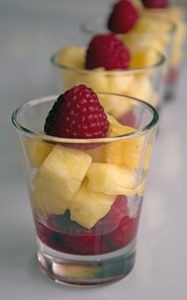 Des verrines remplies de cubes d'ananas et de framboises sucrées, voici un joli dessert tout en légèreté, à préparer en 15 minutes.